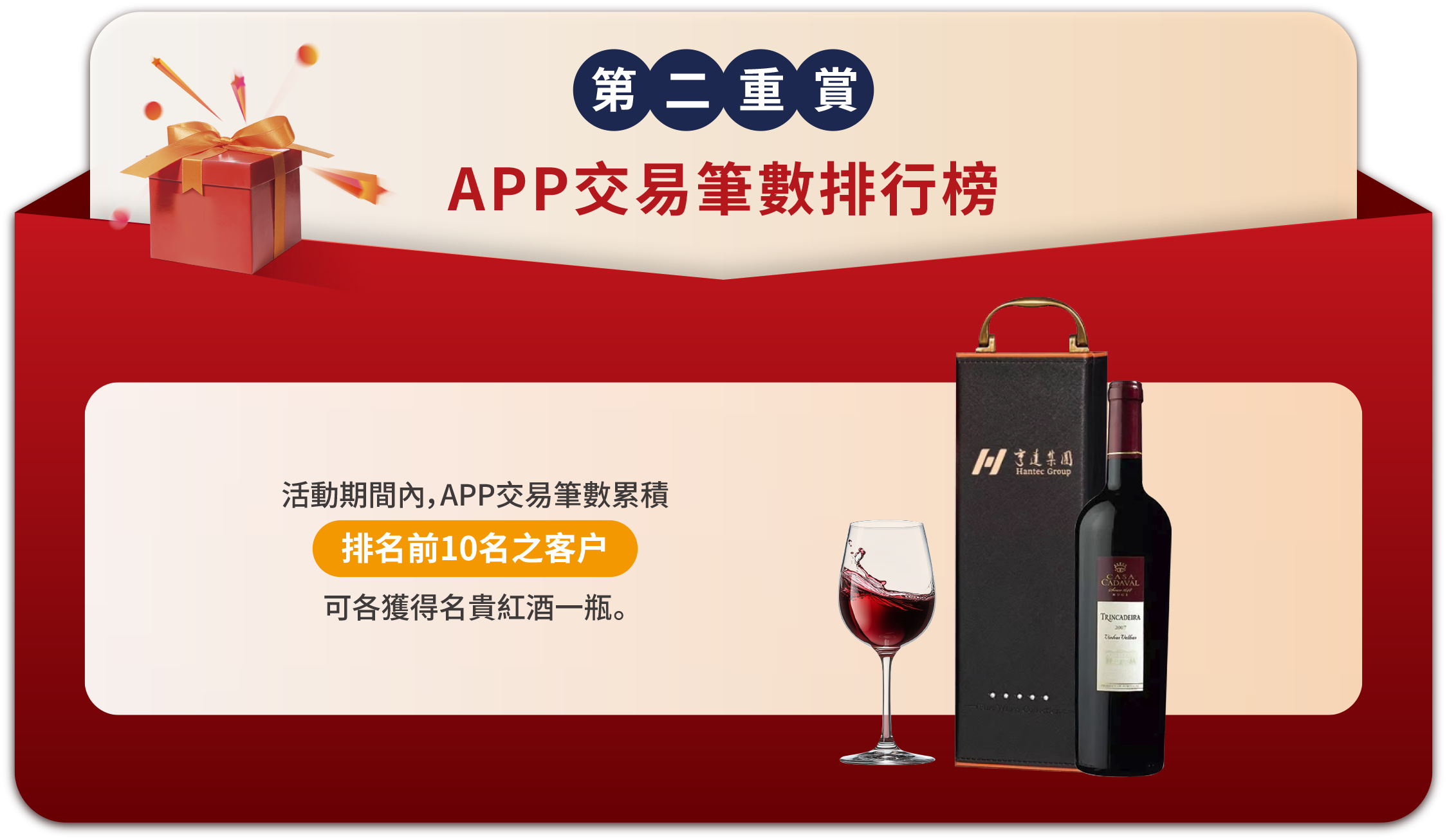 ★ 第二重賞:活動期間APP交易筆數累計排名前10名的客戶將各自獲得一瓶名貴紅酒。 - 每位客戶可分別獲得第一重賞和第二重賞獎品,即同一客戶可同時獲得兩份獎品,前提是符合各重賞條件。