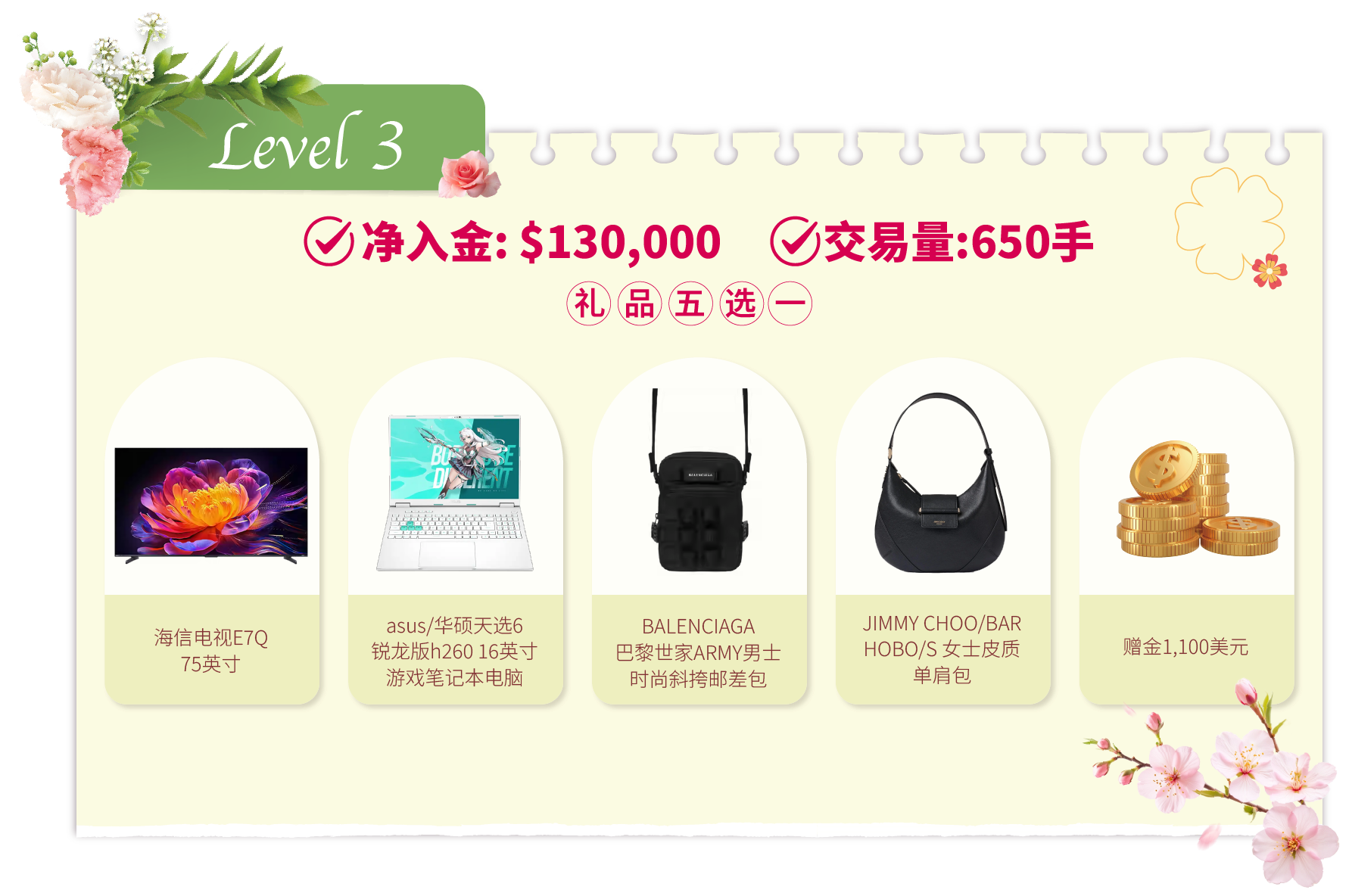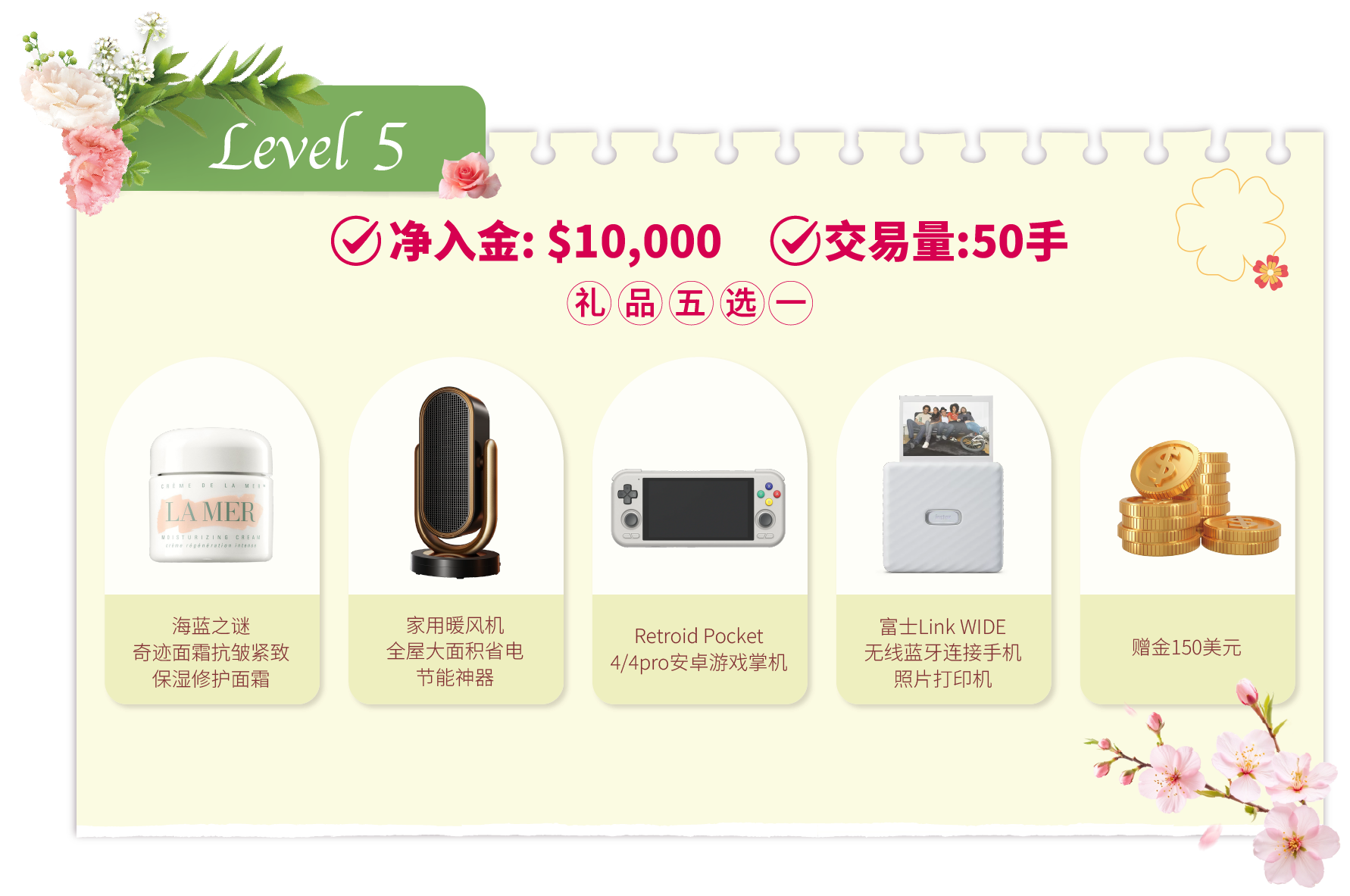 - 活动内容: 客户在登记活动后,活动期间内的净入金和平仓手数(美股产品不计算在内)达到相应要求,即可在层级的奖品进行五选一。若使用 亨达APP进行交易,其平仓手数将 按X3倍计算。例如:客户在MT4平仓手数10手及在APP平仓手数10手,实际计算手数为10 + (10×3) = 40手。