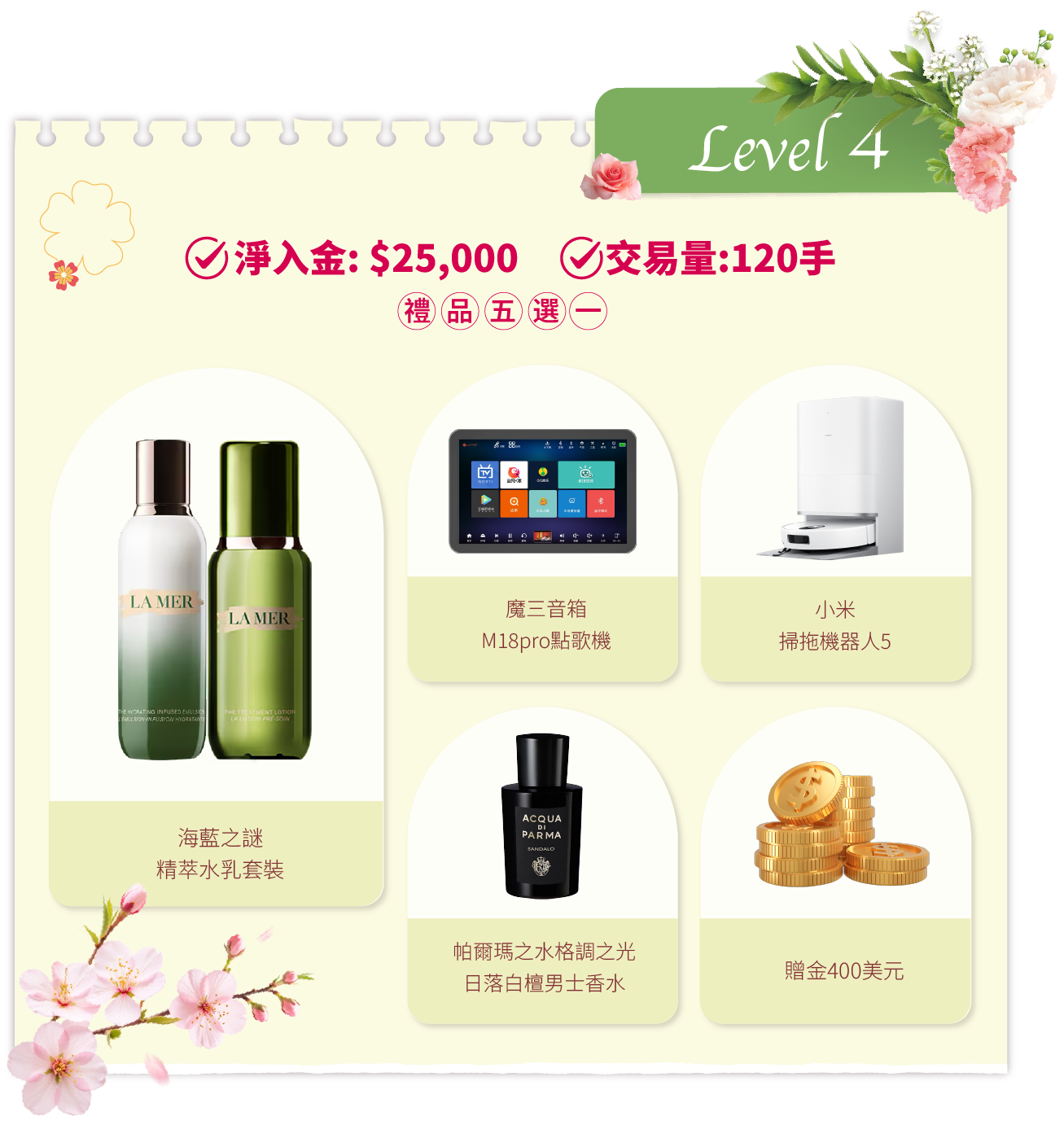 在活動期間內,客戶的淨入金和平倉手數(美股產品不計算在內)達到相應要求,即可在該層級的五件精選禮品中任選其一。若通過亨達APP完成交易,平倉手數將享有 三倍累计计算,助您更快达成目标!