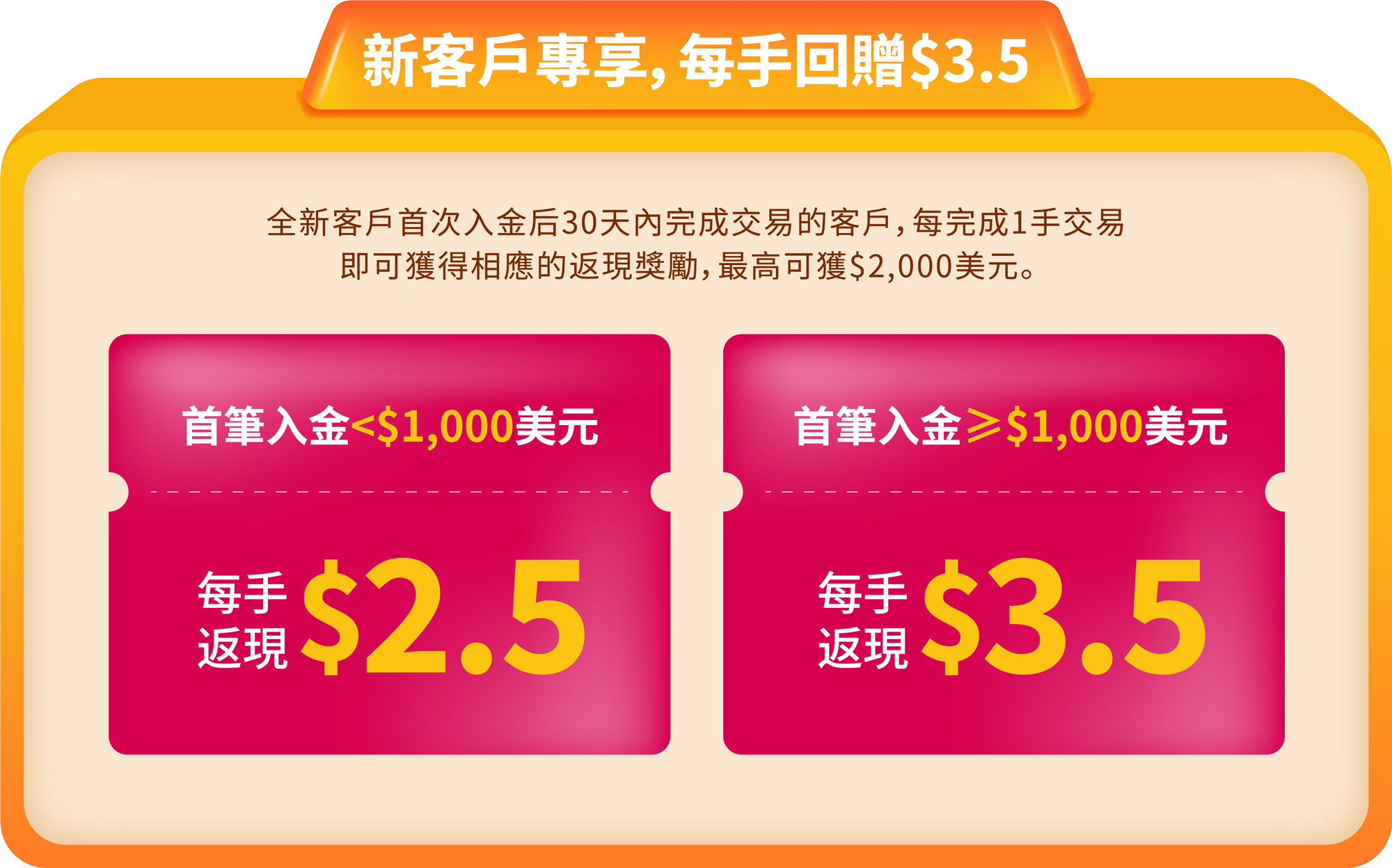 。 首筆入金金額少於$1,000美元的客戶,每手交易返現$2.5美元,最高返現金額為$2,000美元。
