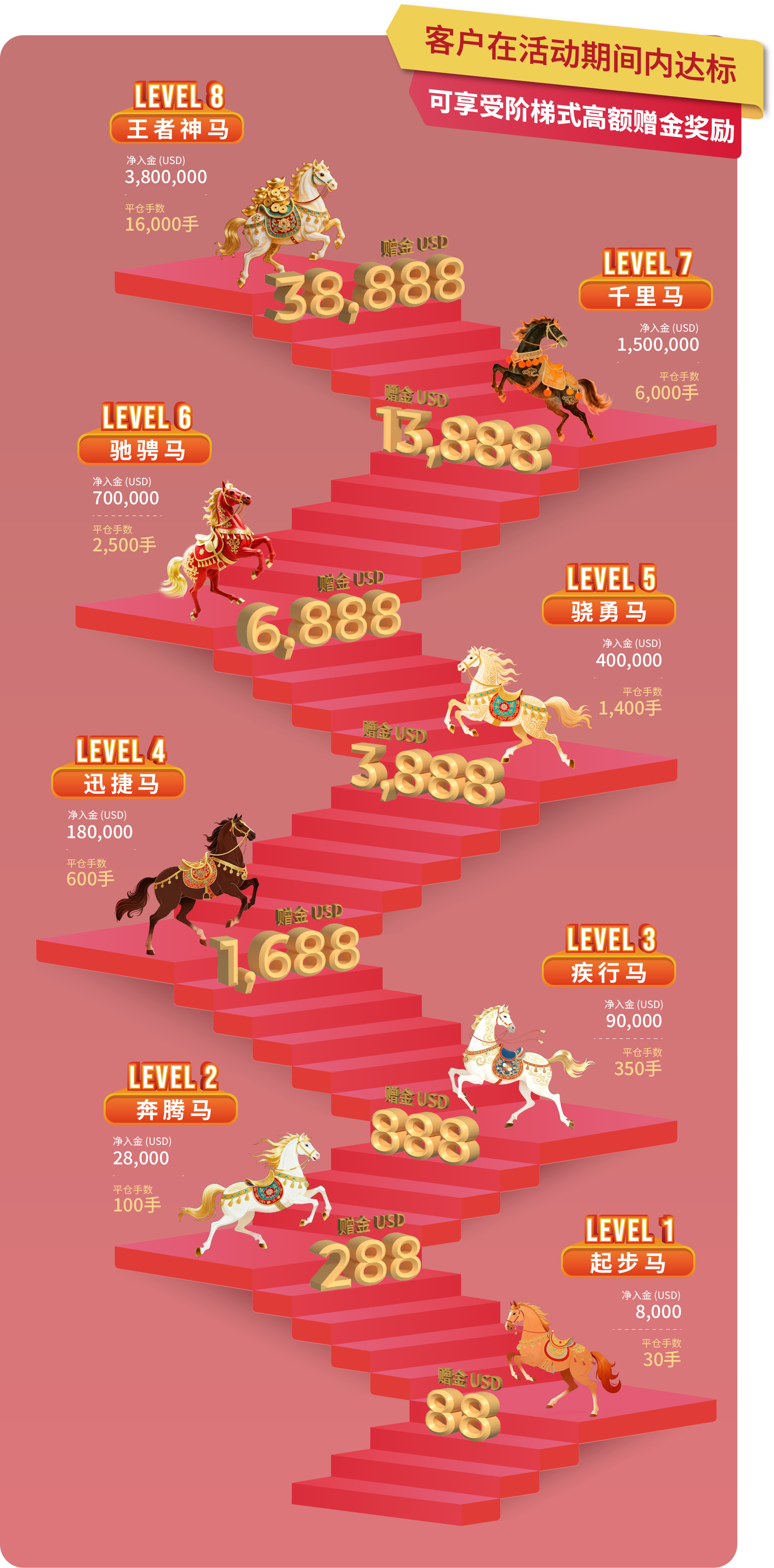 - 活动内容:客户在登记活动后,活动期间内的净入金和平仓手数(美股产品不计算在内)达到相应要求,即可获得该层级对应的赠金。