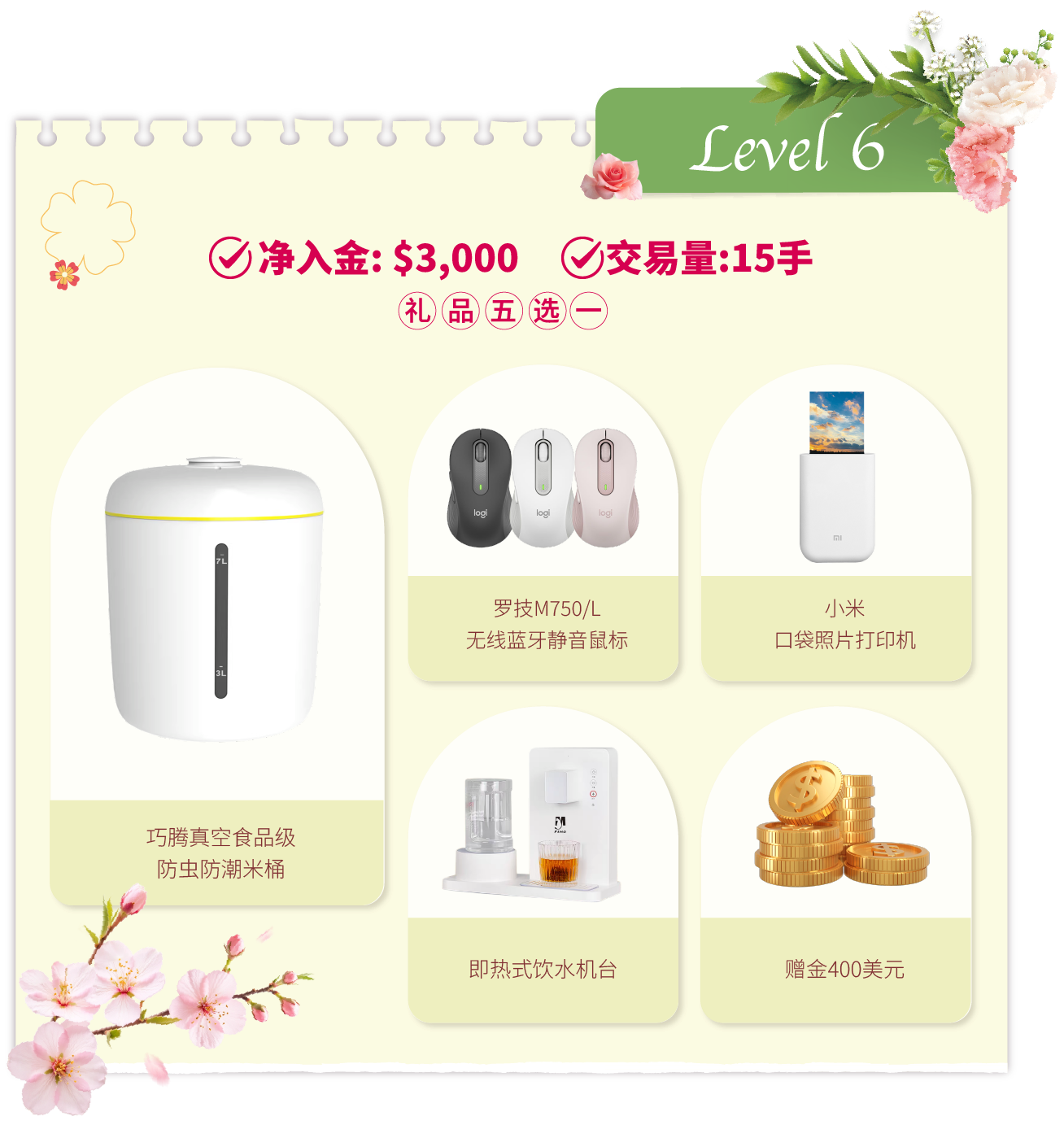 在活动期间内,客户的净入金和平仓手数(美股产品不计算在内)达到相应要求,即可在该层级的五件精选礼品中任选其一。若通过亨达APP完成交易,平仓手数将享有三倍累计计算,助您更快达成目标!
