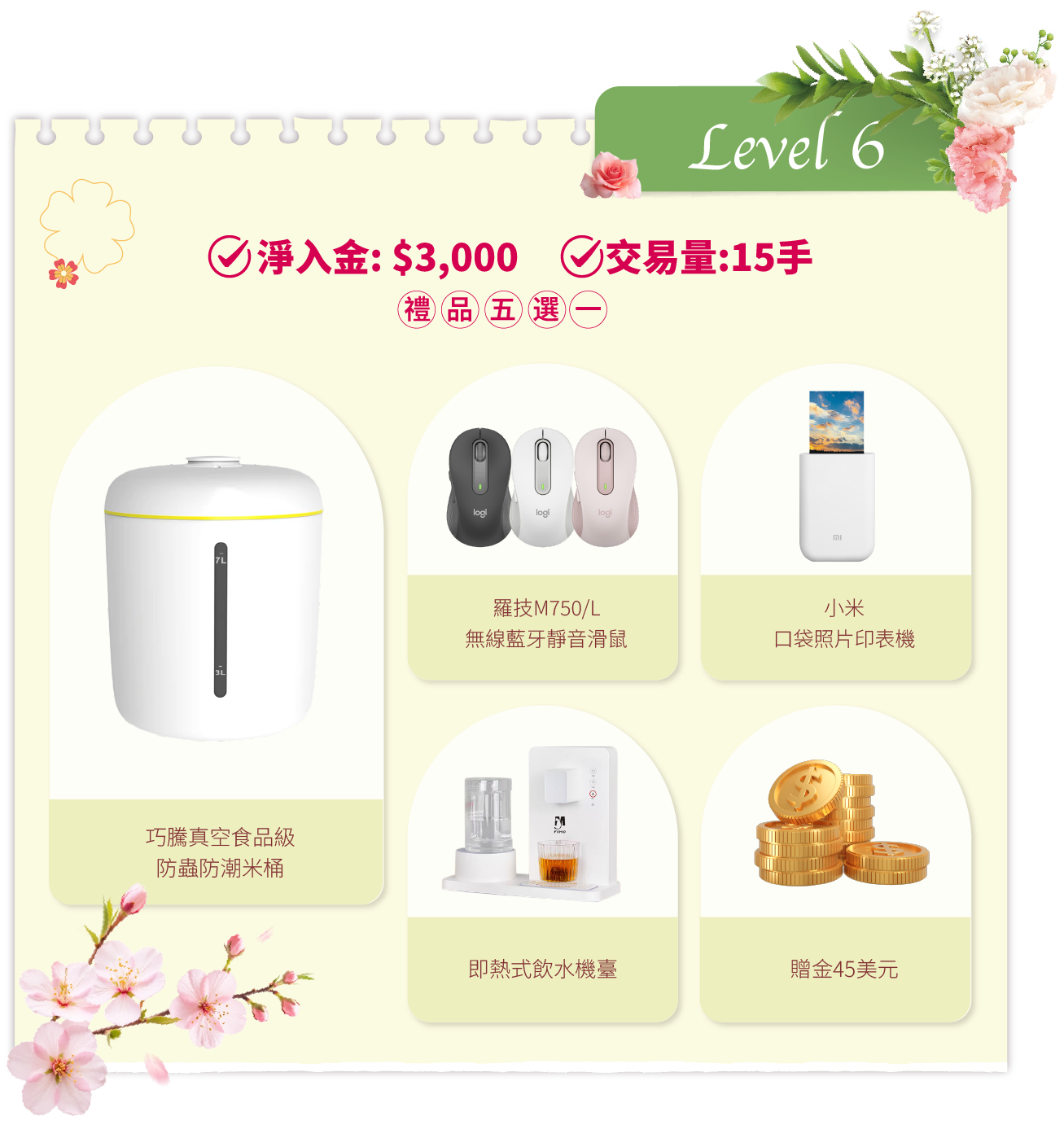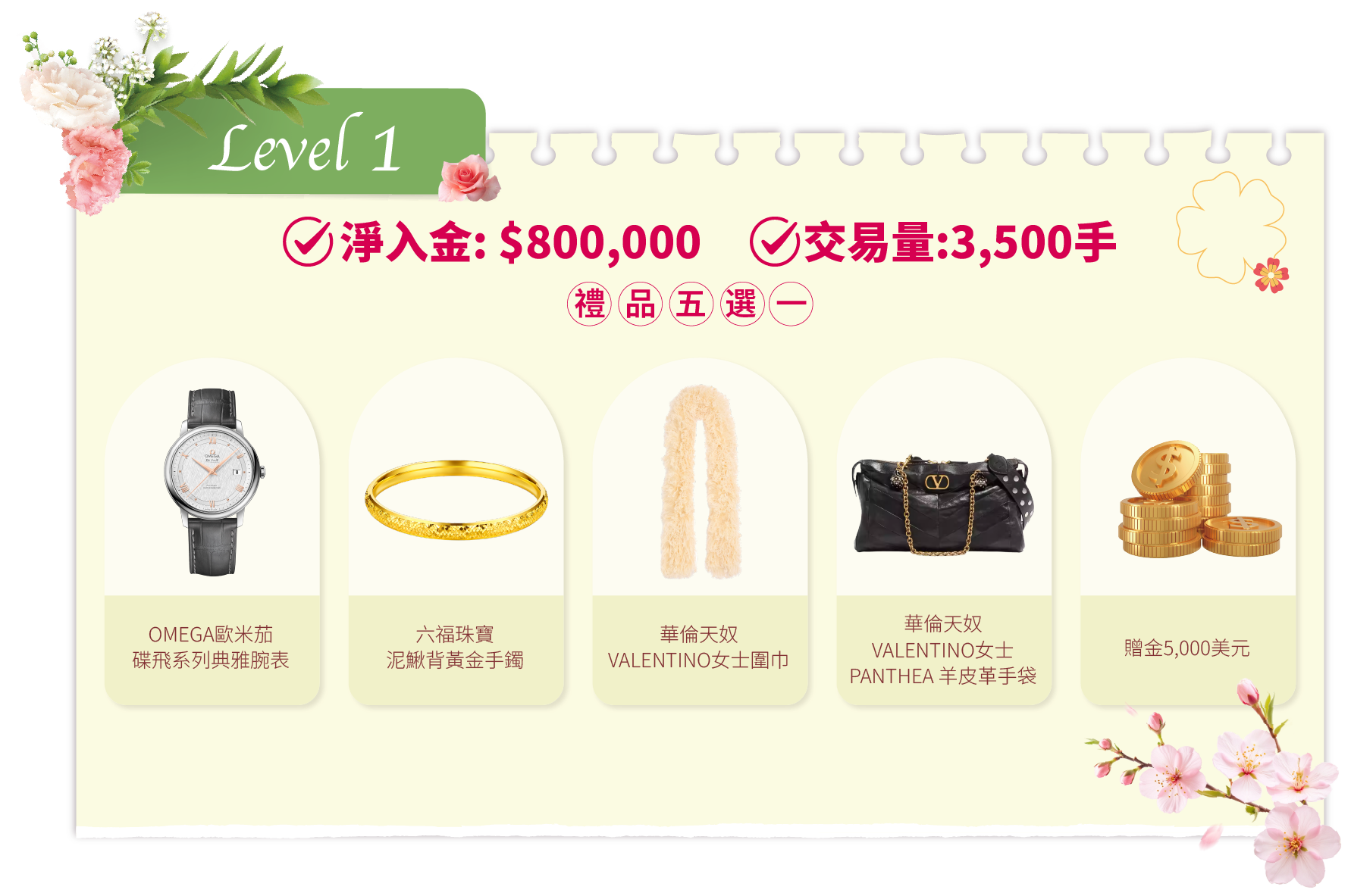 在活動期間內,客戶的淨入金和平倉手數(美股產品不計算在內)達到相應要求,即可在該層級的五件精選禮品中任選其一。若通過亨達APP完成交易,平倉手數將享有 三倍累计计算,助您更快达成目标!