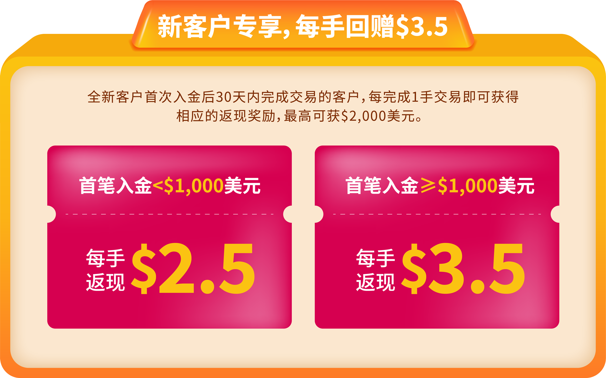 。 首笔入金金额等于或超过$1,000美元的客户,每手交易返现$3.5美元,最高返现金额为$2,000美元。