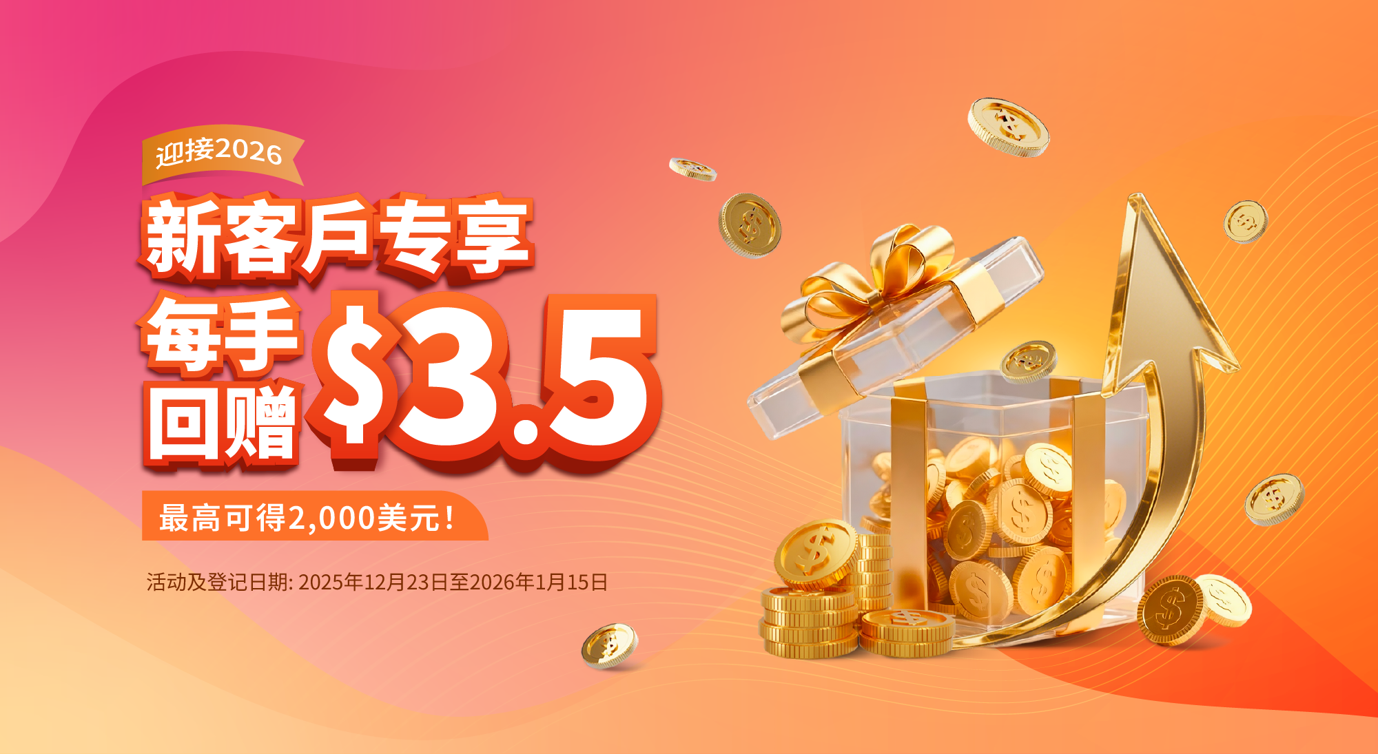 。 新客户须在活动期间内完成首次入金,最后可入金日期为 2026 年 1 月 15 日。